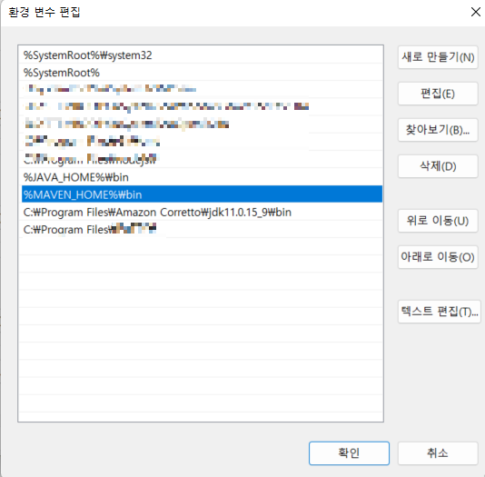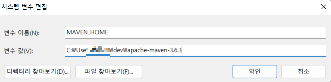 위와 같이 변수 이름에 MAVEN_HOME 변수 값에는 각자 설치한 파일의 경로를 복사해준다.