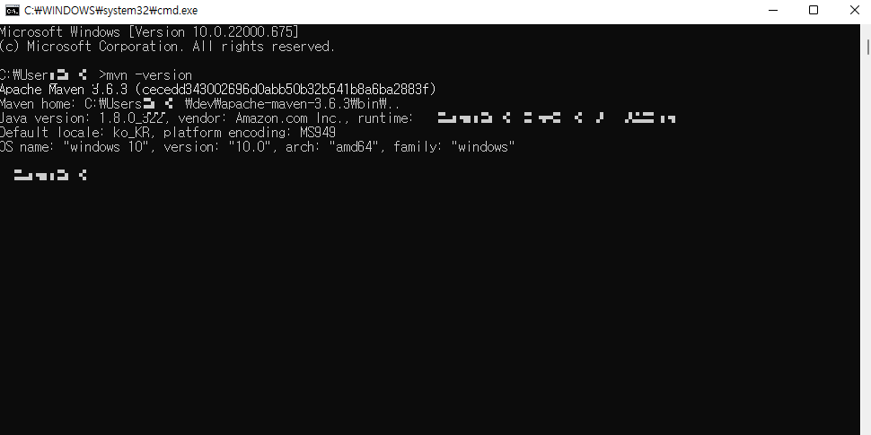4. 설정이 완료되면 maven 버전을 확인하였을 때 cmd > mvn -version으로 확인 가능하다.