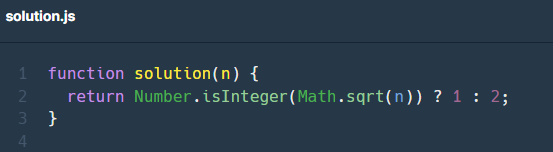n이 제곱수인지 확인하기 위해 Math.sqrt()를 사용하여 n의 루트값을 구한 후 이 수가 정수라면 1, 아니라면 2를 반환한다.